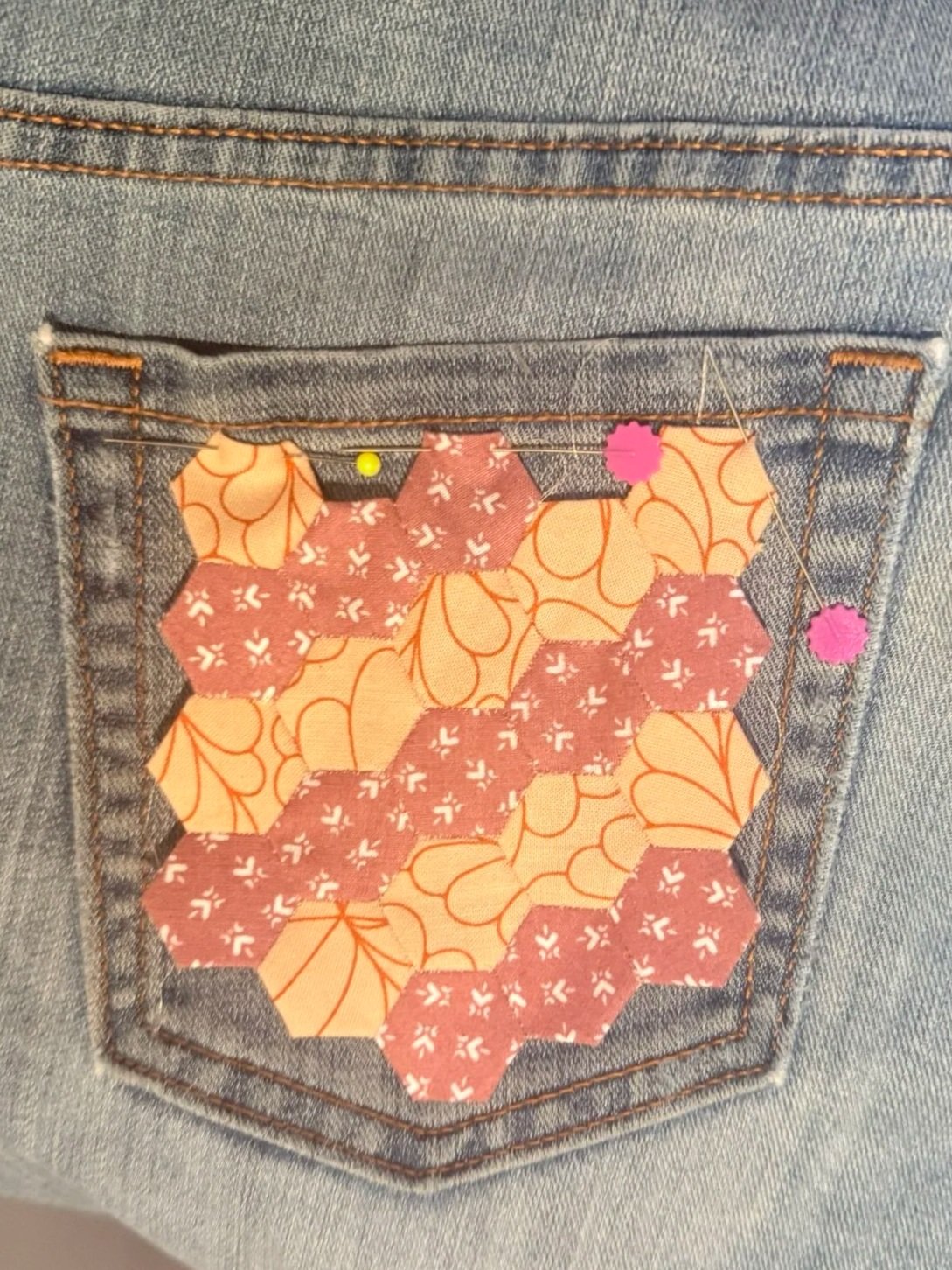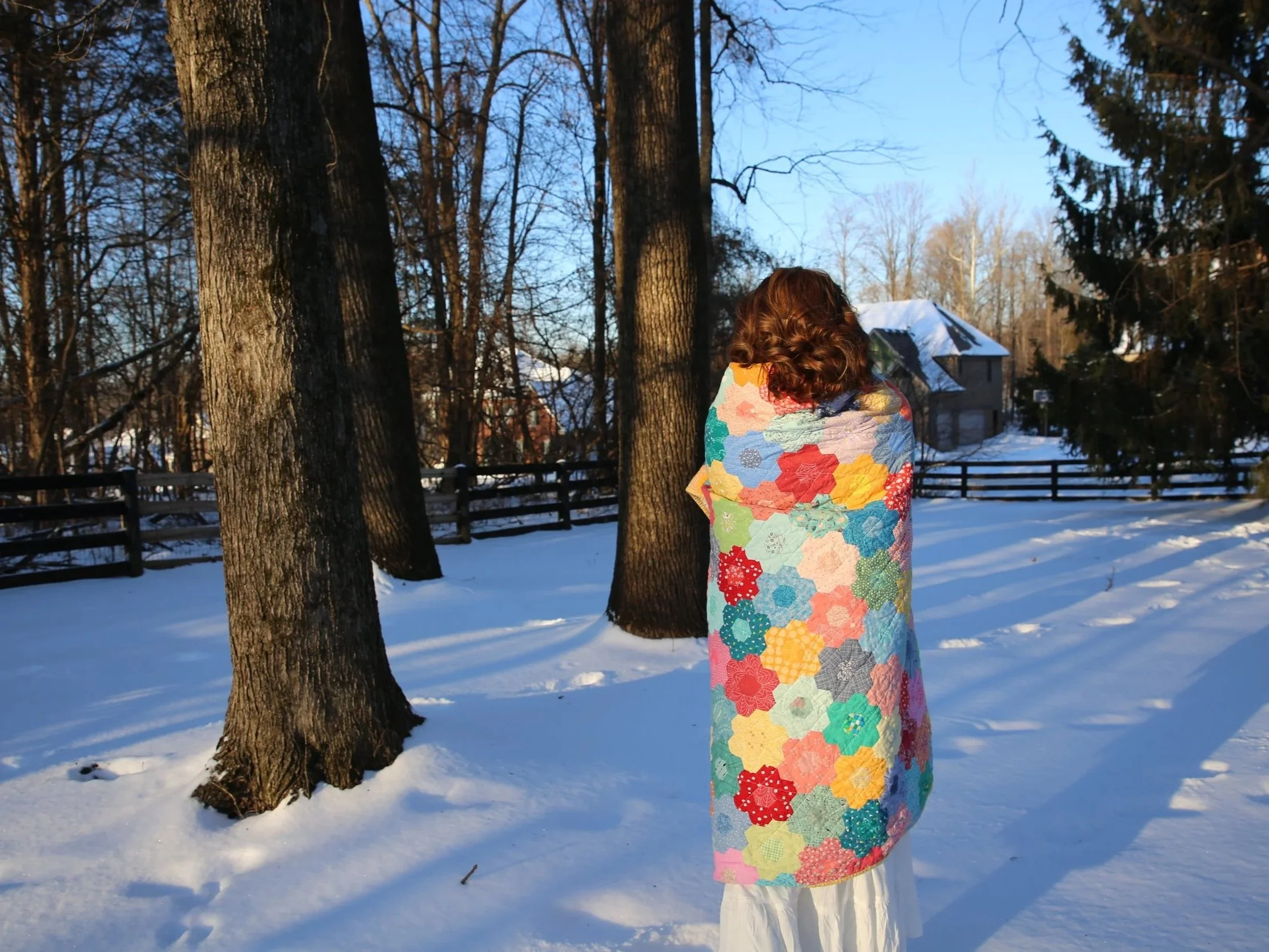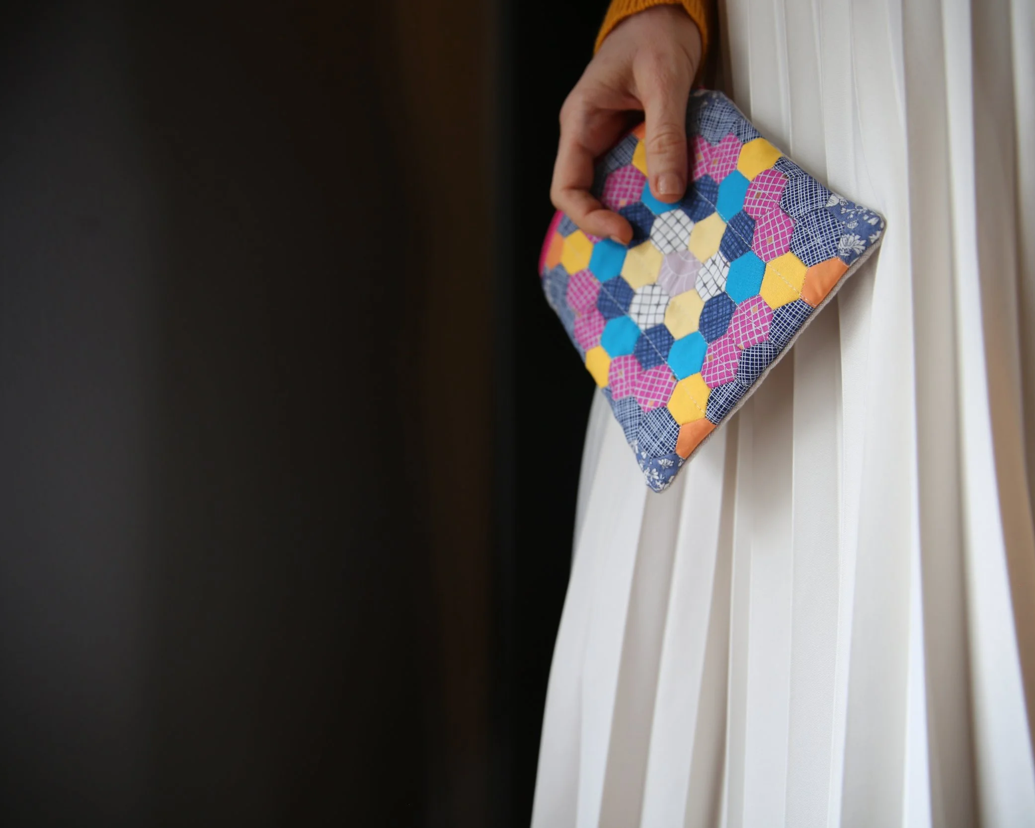 This pattern features a bold geometric design in a functional clutch. Those who are new to english paper piecing and who have basic sewing machine skills will find it a fun challenge. It includes paper piecing instructions, zipper pouch construction steps, hexagon chart, pictures, video tutorial links, and half-inch hexagon templates.